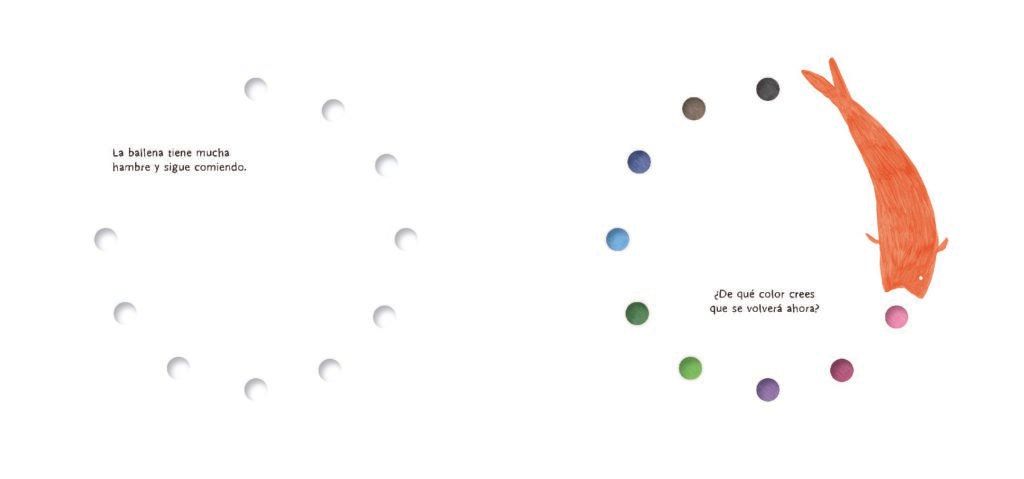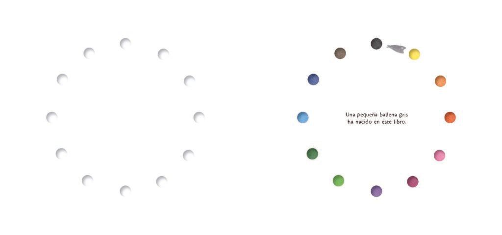 Una pequeña ballena gris ha nacido en este libro. Mientras prueba los colores del arco iris, se hace cada vez más grande. Cuando se come la última bolita, ya anochece. Es hora de acostarse.