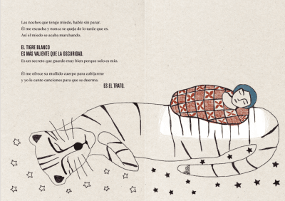 "Tengo un tigre blanco de nieve y carbón. Él me da todos los colores. Tengo un tigre blanco de papel y tormenta, y me guarda todas las palabras. Tengo un tigre blanco que me acompaña, incluso cuando no está".