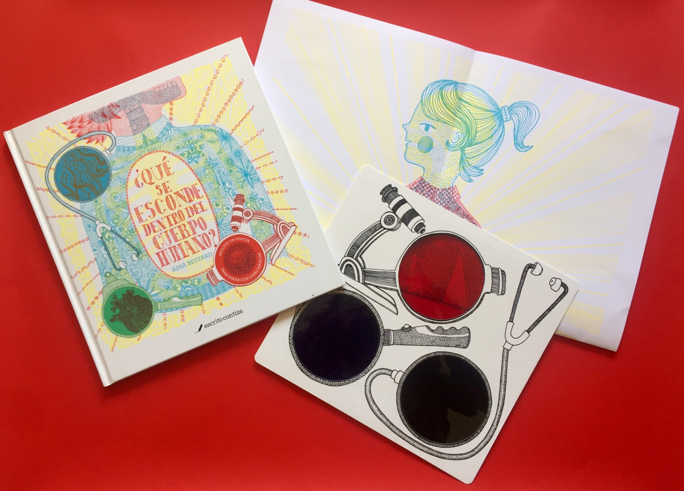 Si miras a través de las lupas, verás muchos detalles que no se ven a simple vista. Empieza por la lupa verde y te parecerá que el cuerpo es solo lo que se ve desde fuera; después, mira a través de la lupa azul y empezarán a aparecer miles de elementos que no habías visto antes. Y, finalmente, si lo miras con la roja, descubrirás muchos secretos de esta máquina extraordinaria.