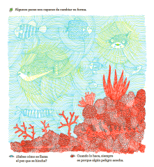 ¿Qué se esconde dentro del mar? Si miras a través de las lupas, verás muchas cosas que no se ven a simple vista. Empieza por la lupa verde de la escafandra y te parecerá que nada se mueve; después, mira a través de las gafas de buceo azules y empezará a aparecer la vida y, finalmente, si miras por la ventana roja del submarino,